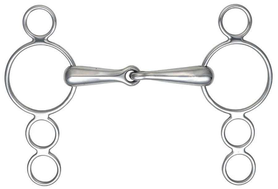 DESCRIPTIONThis stainless steel bit is useful when control is an issue - the three rings offer leverage options to increase the severity. The 5" and smaller sizes of this bit have smaller rings to ensure the bit remains in proportion. Mouthpiece thickness: 21mm. Cheek height: 160mm (4.5", 5"), 180mm (5.5", 6").